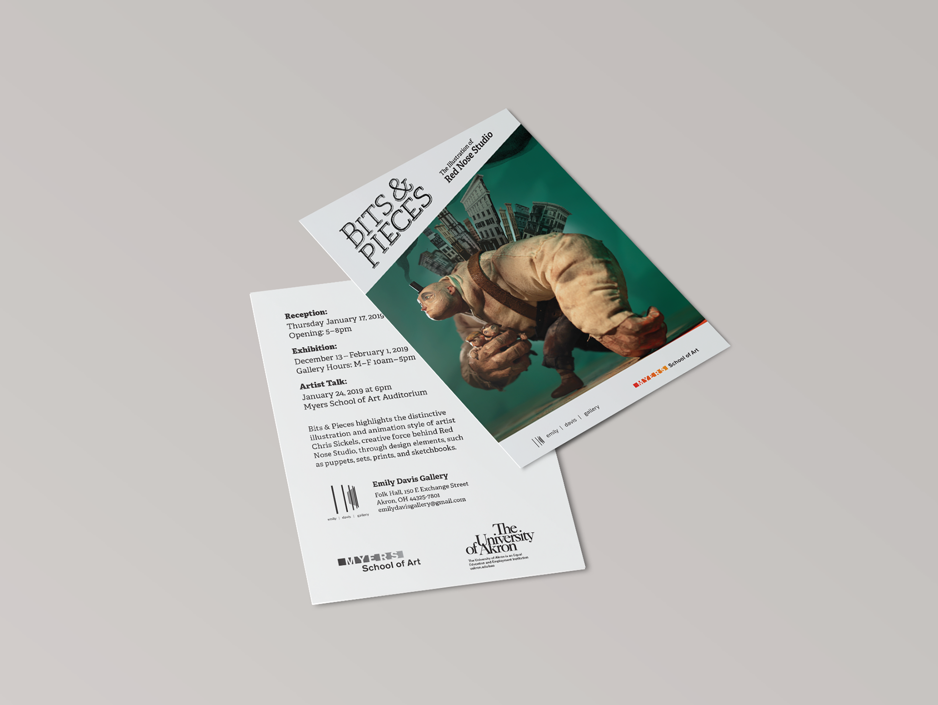 Bits & Pieces was an exhibition held at the Emily Davis Gallery which featured the dimensional and printed works of Chris Sickels. I was tasked with creating a look and feel for the title design of the show, as well as for the printed and web marketing materials. For the show title design, I created a hand-lettered piece with graphite that was later hand-painted onto the wall for the show. For the marketing pieces, I chose to let the artwork shine by allocating the show information to the white geometric shapes framing the image. The shapes as well as the typographical style were chosen as a reference to the look of Chris Sickels' works.